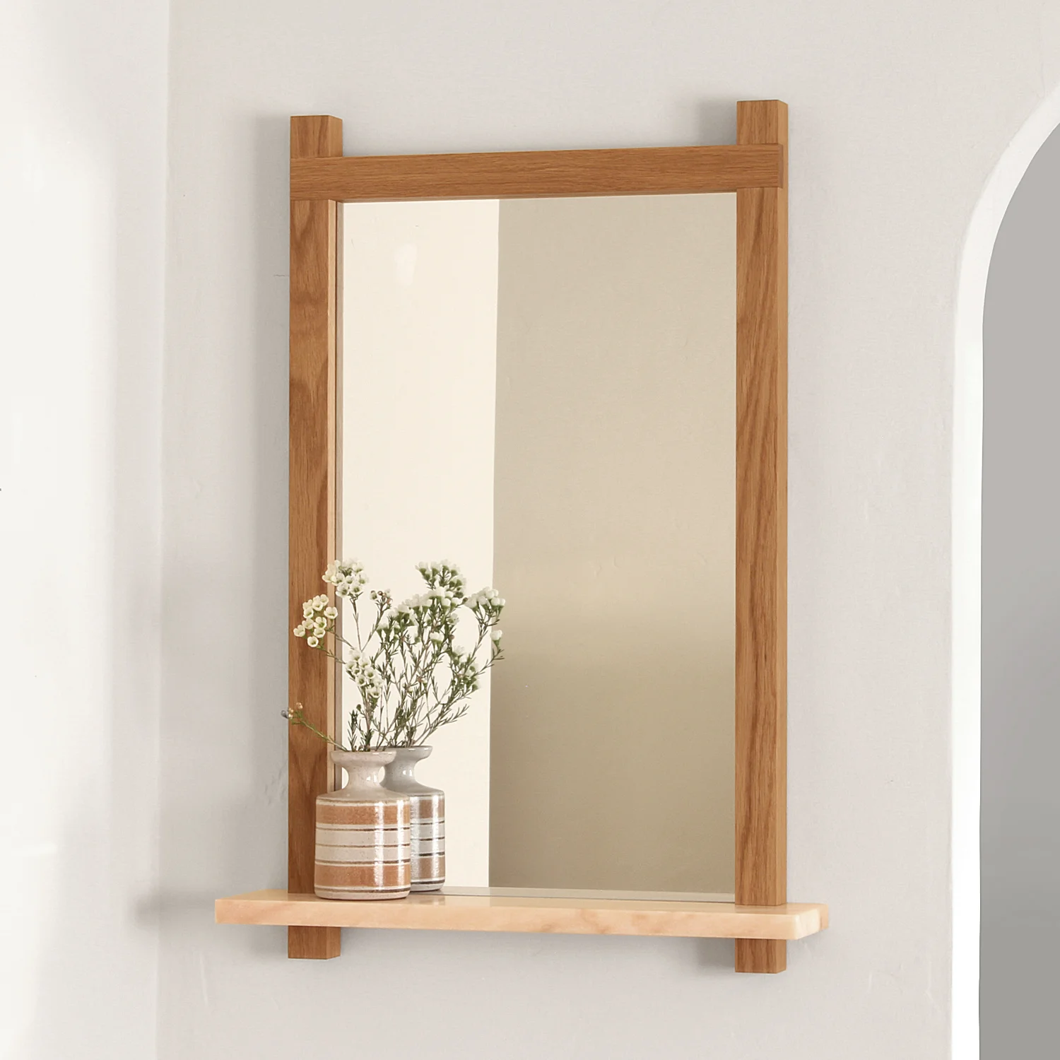 Solid wood mirror frame with stone shelf, traditional joinery creates a solid multifunctional platform. Wood species and stone customizable.